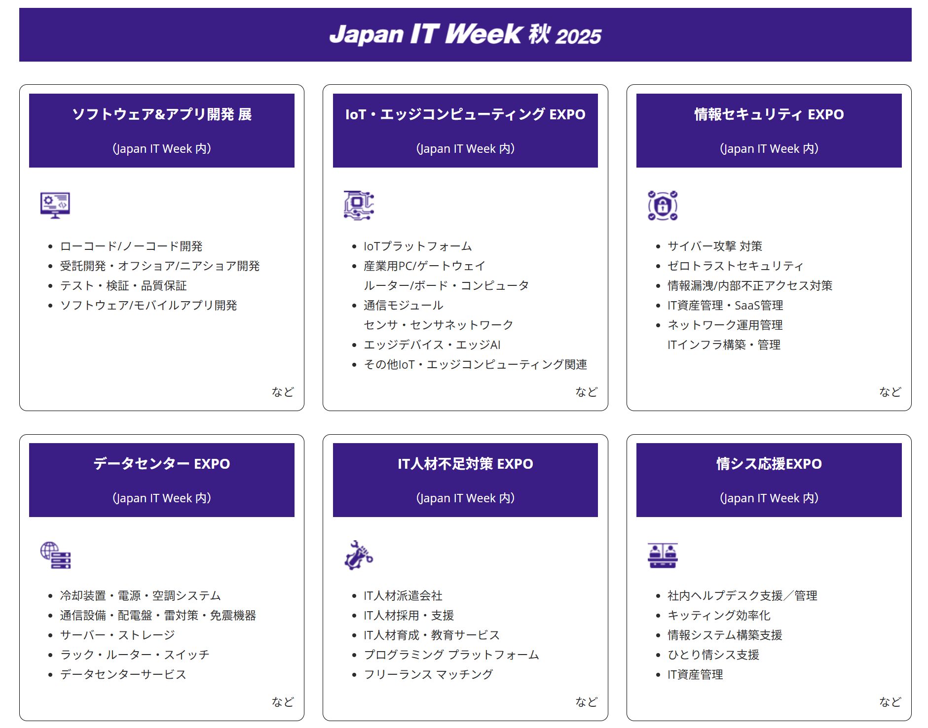 2025年10月22日(水)〜24日(金)に開催される「Japan IT Week【秋】2025」は、以下の6つの専門展示会で構成されています。