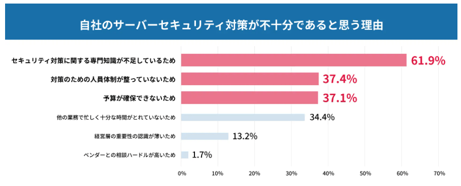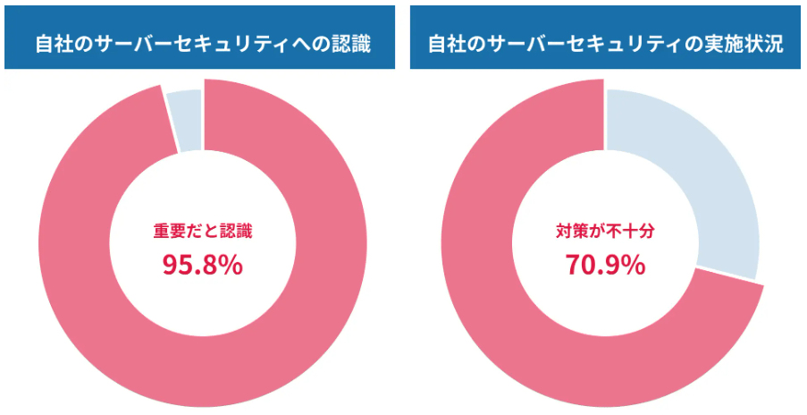 同調査レポートによると、中小企業のサーバー担当者の9割以上がサーバーのセキュリティ対策を「重要」であると認識しています。その一方で、7割以上が「自社のセキュリティ対策は不十分」であると回答しており、意識と実態が大きく乖離していることが明らかになっています。