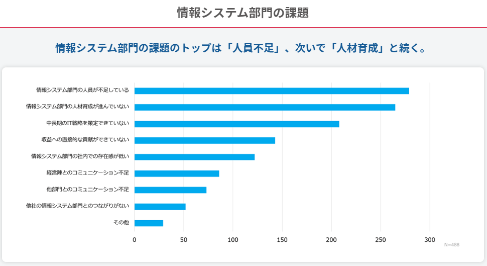 「全国情シス実態調査2025」によると、情シス部門の課題のトップ2は「人員不足」と「人材育成の遅れ」です。あなたが所属する情シス部門ではどうでしょうか。人材不足については業界全体で共通している傾向がありますので、たとえ今は問題がなくても将来的に大きな課題となる可能性があります。