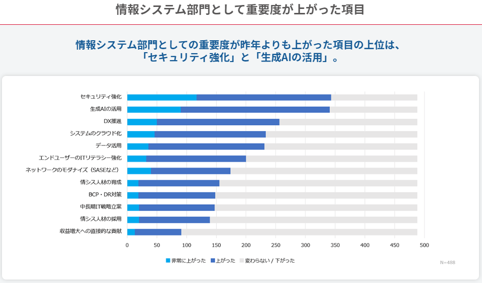「全国情シス実態調査2025」によると、情シス部門としての重要度が昨年よりも上がった項目のトップ2は「セキュリティ強化」と「生成AIの活用」です。3位以下を大きく引き離しています。あなたが所属する情シス部門でも似たような傾向があるのではないでしょうか。スキルを磨くなら、このセキュリティと生成AIを中核に据えるのが効果的といえます。
