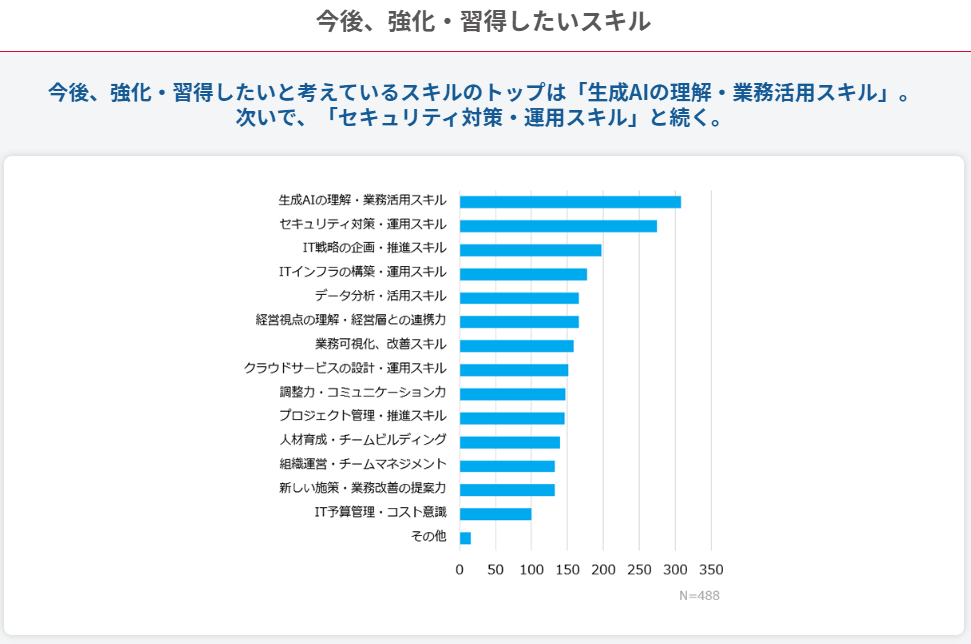 「全国情シス実態調査2025」に掲載されている調査データ「今後、強化・習得したいスキル」は参考になります。実際に需要があるスキルとは必ずしも一致しないものの、業界のトレンドや世間の関心事などが反映されていますので、一通り押さえておくとよいでしょう。