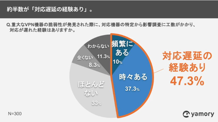 さらに「重大なVPN機器の脆弱性が発見された際に、対応が遅れた経験があるか」という問いに対して「頻繁にある」(10%)、「時々ある」(37.3%)と回答したのは合計で47.3%。つまり、約半数が対応遅延の経験があるということになります。